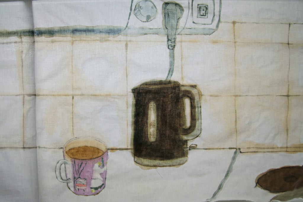 My work is a long scroll portrait of my kitchen counter with all kinds of bottles and things that I have needed for cooking during the quarantine. I painted on an old bed sheet that I modified into a 296cm long canvas, as I did not find any other method of making a long scroll in a short time. Upon making some research online I found out how to turn the purple color of boiled cabbage into different shades of pink, blue and brown by adding salt, soda, lemon juice and vinegar and accidentally burning it. I made all colors and glue of edible ingredients, which means my painting is completely biodegradable (although this means that I could not reproduce all colors that I would have wanted). I worked on two tables in the living room of the 45 m2 one-room apartment that I share with my partner, which is also our kitchen.